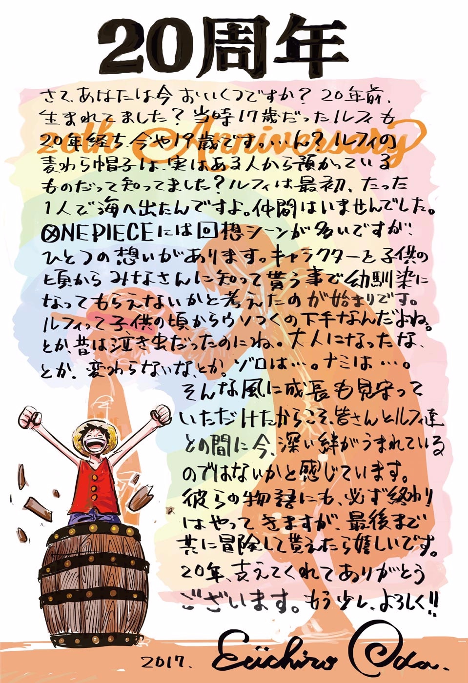 现在尾田的固定留言地方有两处,一个是OP.COM官网的不定期涂鸦留言,另一个是JUMP杂志上的卷末语留言。(这些汉化详见:http://bbs.talkop.net/thread-1704-1-1.htm)