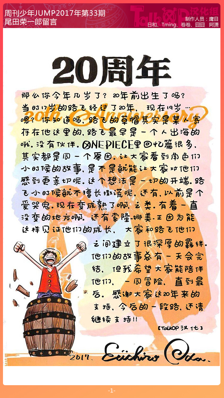 2015年1月,致力于海贼王周边内容翻译的【TalkOP汉化组】正式成立,希望能聚集更多的伙伴,汉化更多的周边,并一直坚持到海贼王完结哟。
